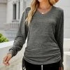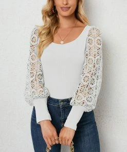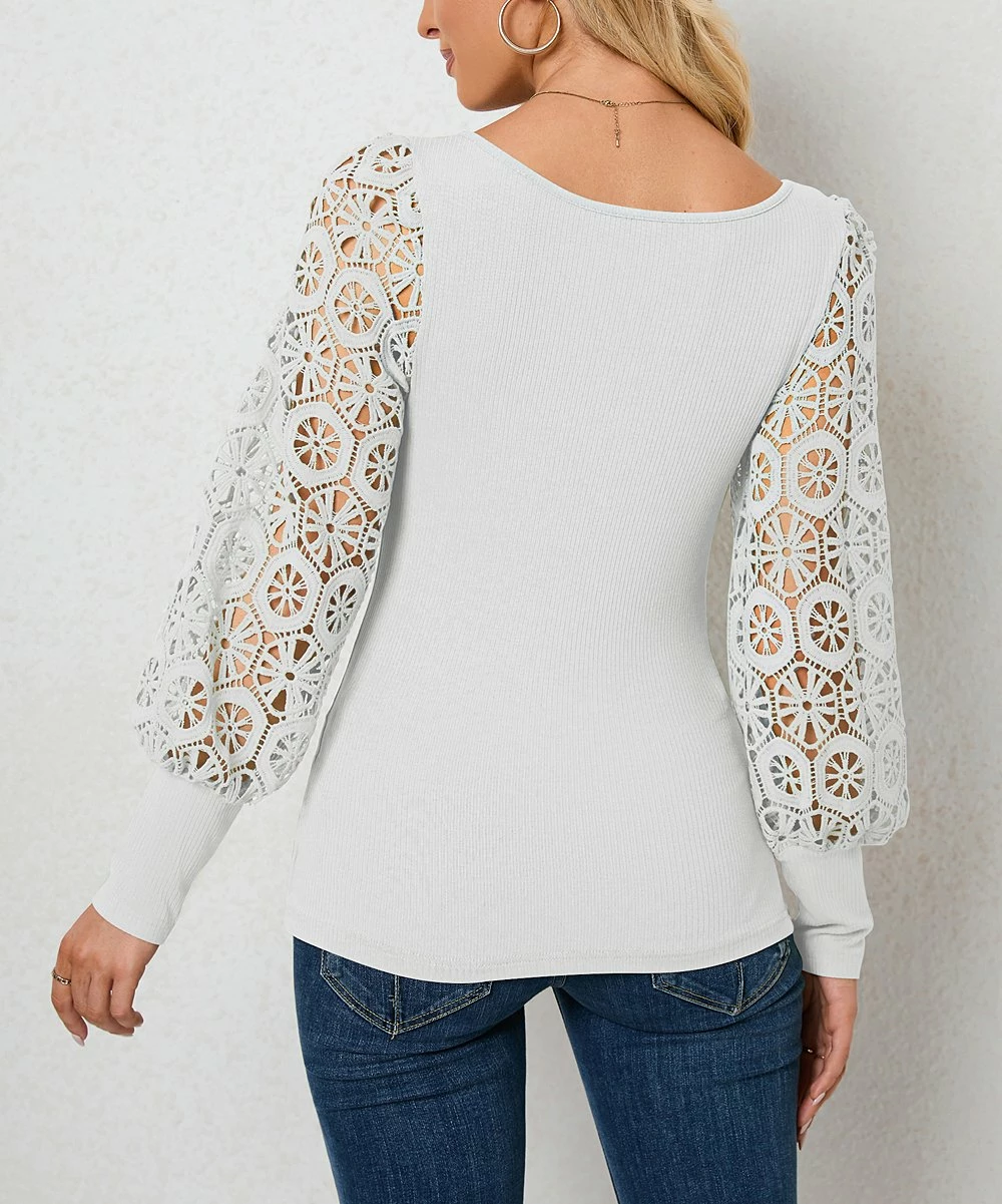 Long lace sleeves add elegance to this scoop neck top featuring stretch infused fabric.