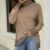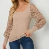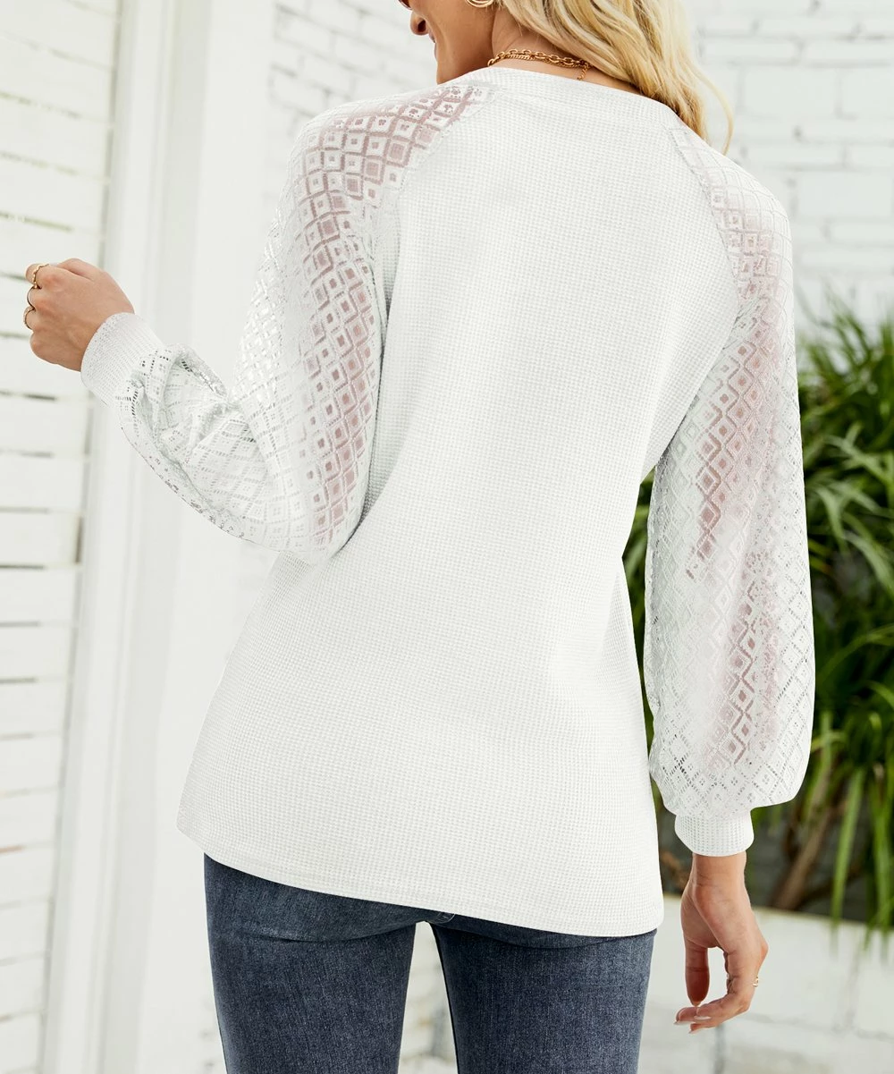 Sheer eyelet lace sleeves add allure to this relaxed top crafted from breathable cotton-blend material.