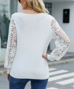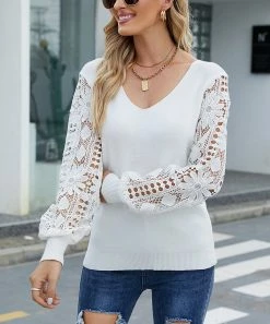 Exude polished vibes while keeping cozy in this v-neck sweater that presents lace sleeves.