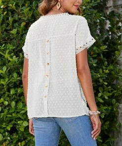 Upgrade your casual ensembles with this stylish tunic sporting lacy accents and button details on its back.
