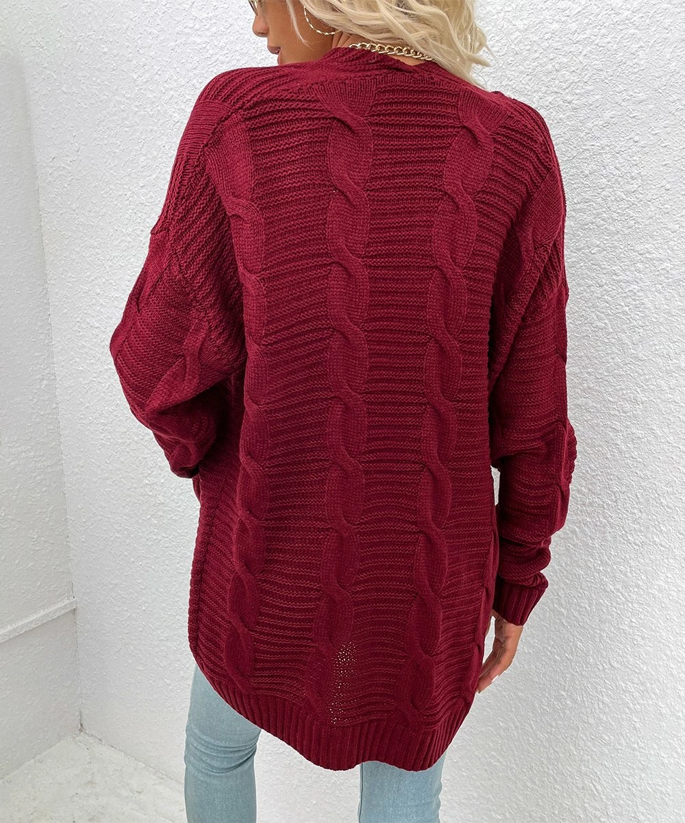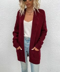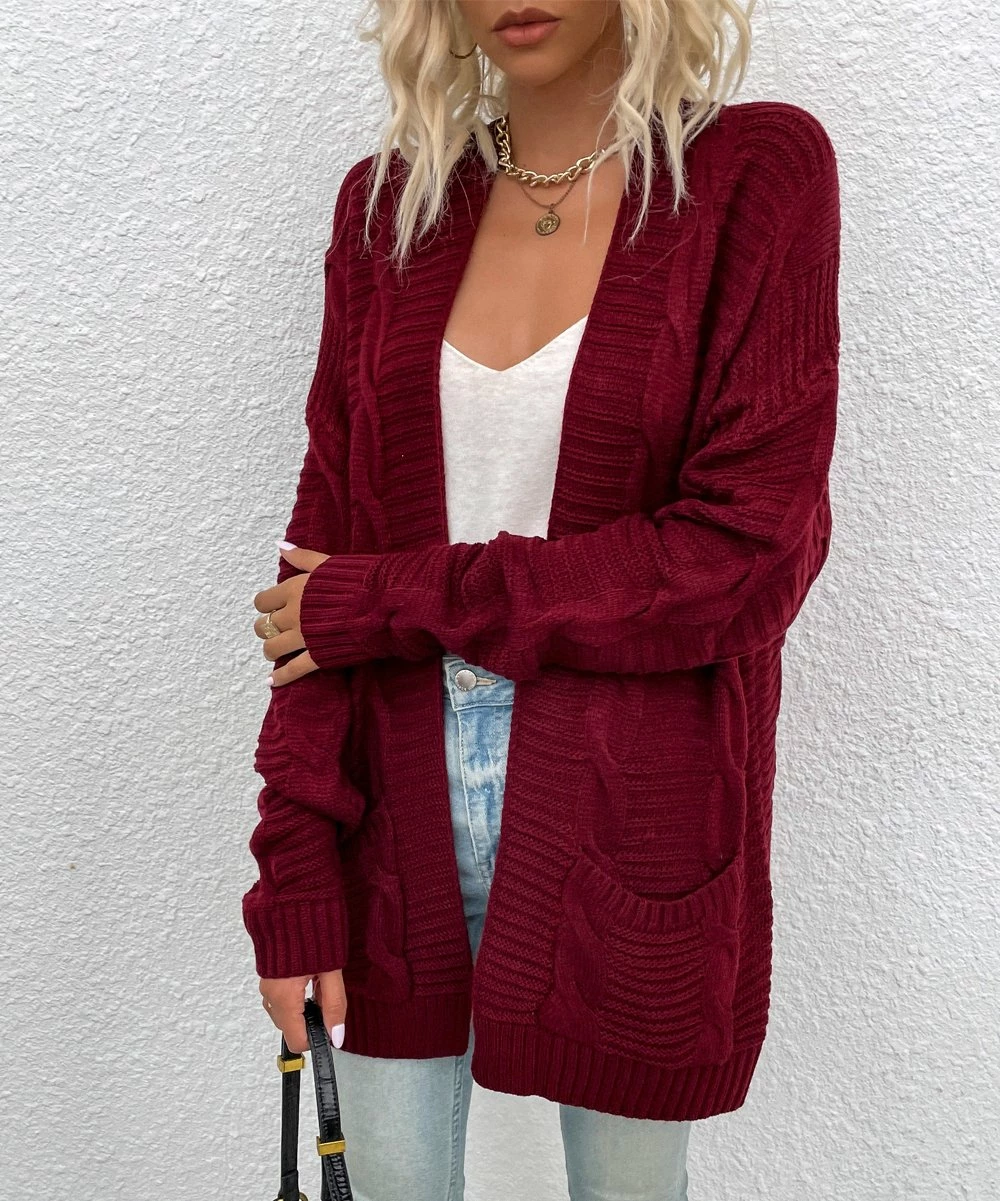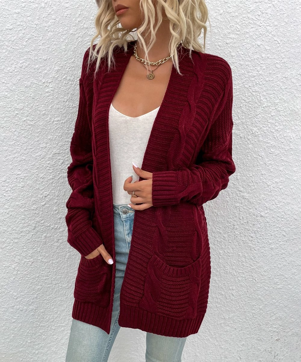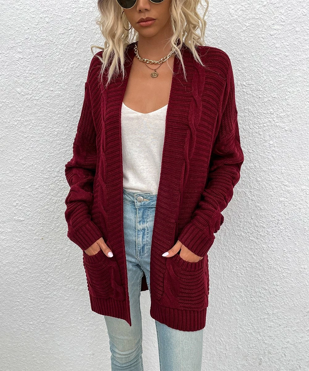 Casual solid-color open cardigan featuring a cable-knit design and front pockets.