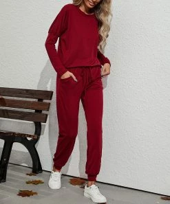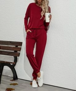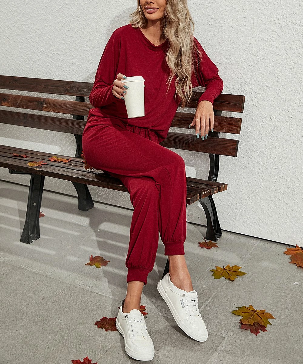 - Includes wine long-sleeve tee and wine joggers (two pieces total)